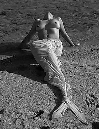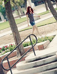 Nude Redhead Mina displays her slender body and shave pussy as she strips on the bed.