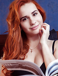 Nude Redhead Nicole La Cray sensually strips her black lingerie on the bed.