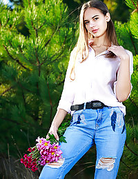 Nude Valencia strips outdoors baring her perky tits and shaved pussy.
