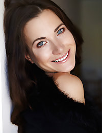 Nude Aislin strips her blue dress on the couch baring her amazing body and creamy pussy.