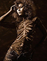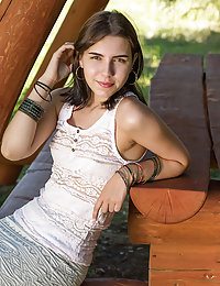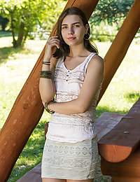 Nude Zhenya Mille strips outdoors baring her nubile body and meaty pussy.