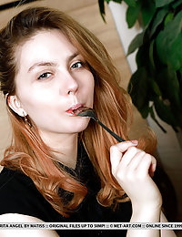 Nude Rita Angel displays her smooth, creamy body and unshaven pussy on the chair.