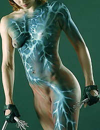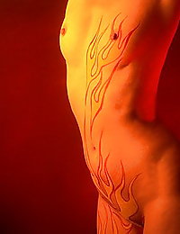 Nude Bambi Joli displays her skinny body with small tits and trimmed pussy on the chair.